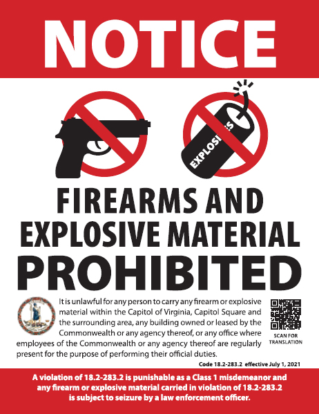 環境中心所有人員和訪客將設置磁力計(穿透裝置)、放置包裝 X 射線機和手持式金屬探測棒,以進行檢查所有周邊中心人員和訪客。這些設備將支持維吉尼亞州禁止在Commonwealth of Virginia擁有或租賃的建築物內攜帶槍支和爆炸物的規定執行,如《維吉尼亞州法典》 18所述。 2 - 283 。 2 。